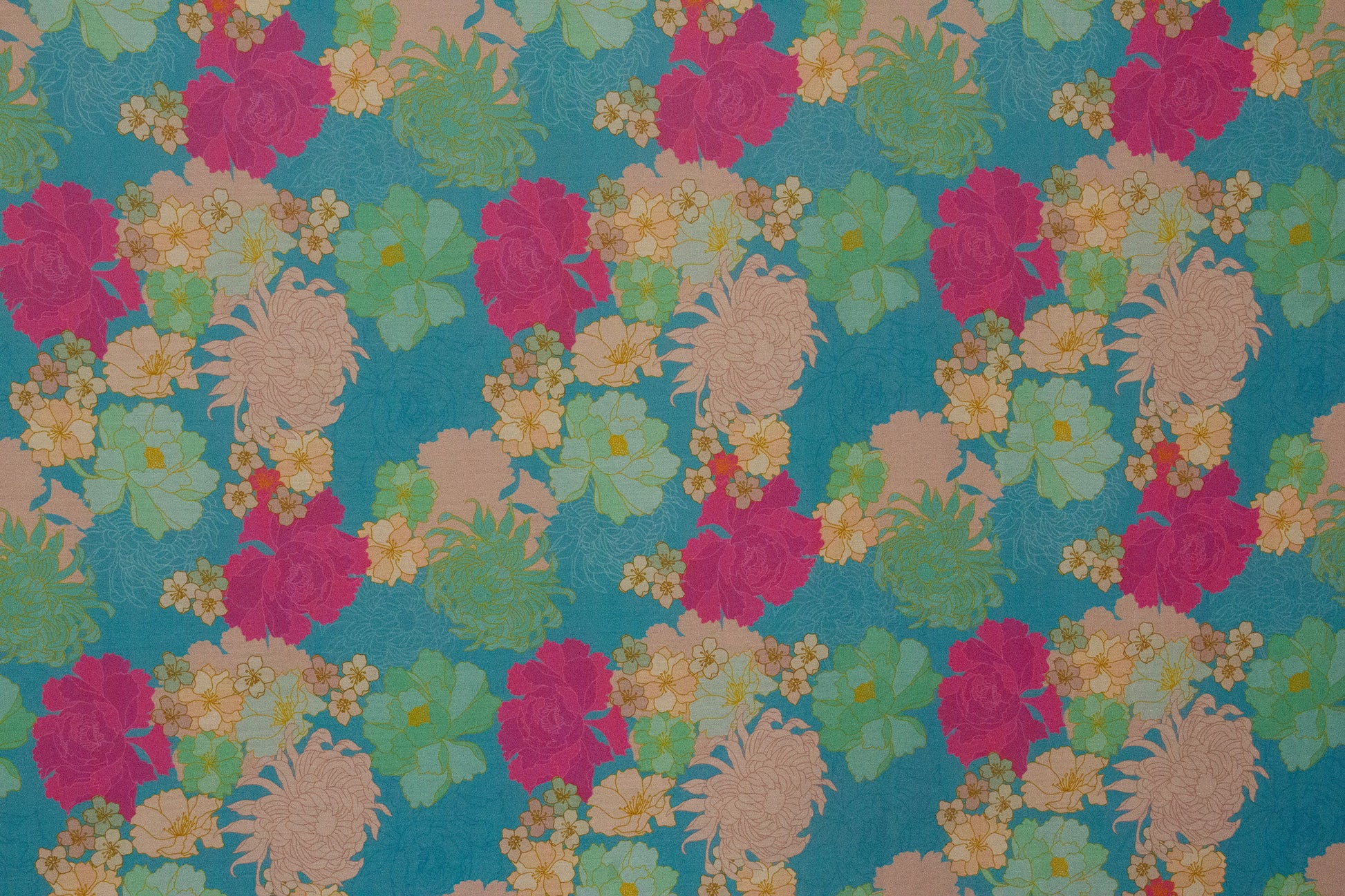 This vibrantly colored Makini print fabric is a true standout. The combination of shades of turquoise, pink and yellow screen-printed into a floral design makes it eye-catching and incredibly popular. The fabric's versatility allows you to look effortlessly trendy and stylish in anything you create, from dresses and skirts to blouses.