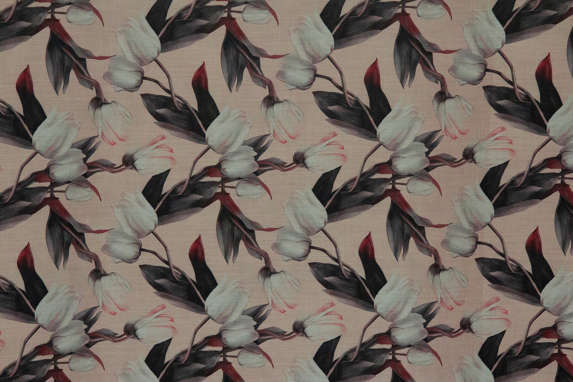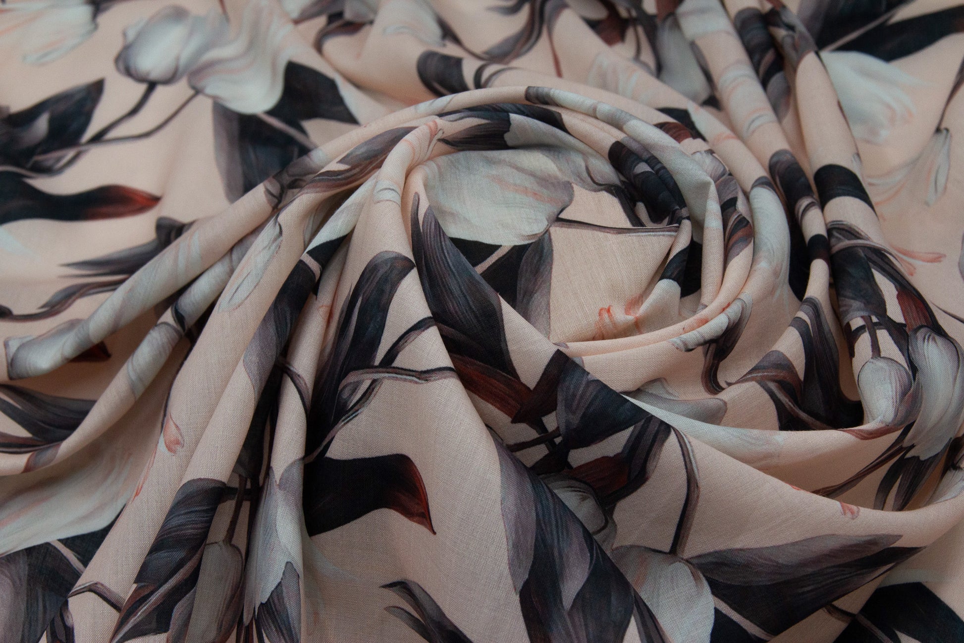 This versatile viscose fabric boasts a beautiful screen-printed design, perfect for crafting elegant bedding (pillowcases, sheets, bedcovers) or comfortable, breathable clothing. Viscose, known for its luxurious softness, drapes beautifully and offers year-round comfort, feeling light and cool in summer and warm in winter. This fabric features a delicate wash of peach in the background, adorned with a charming pattern of grey and brown flowers. The floral design adds a touch of sophistication with its subdued yet elegant color palette.