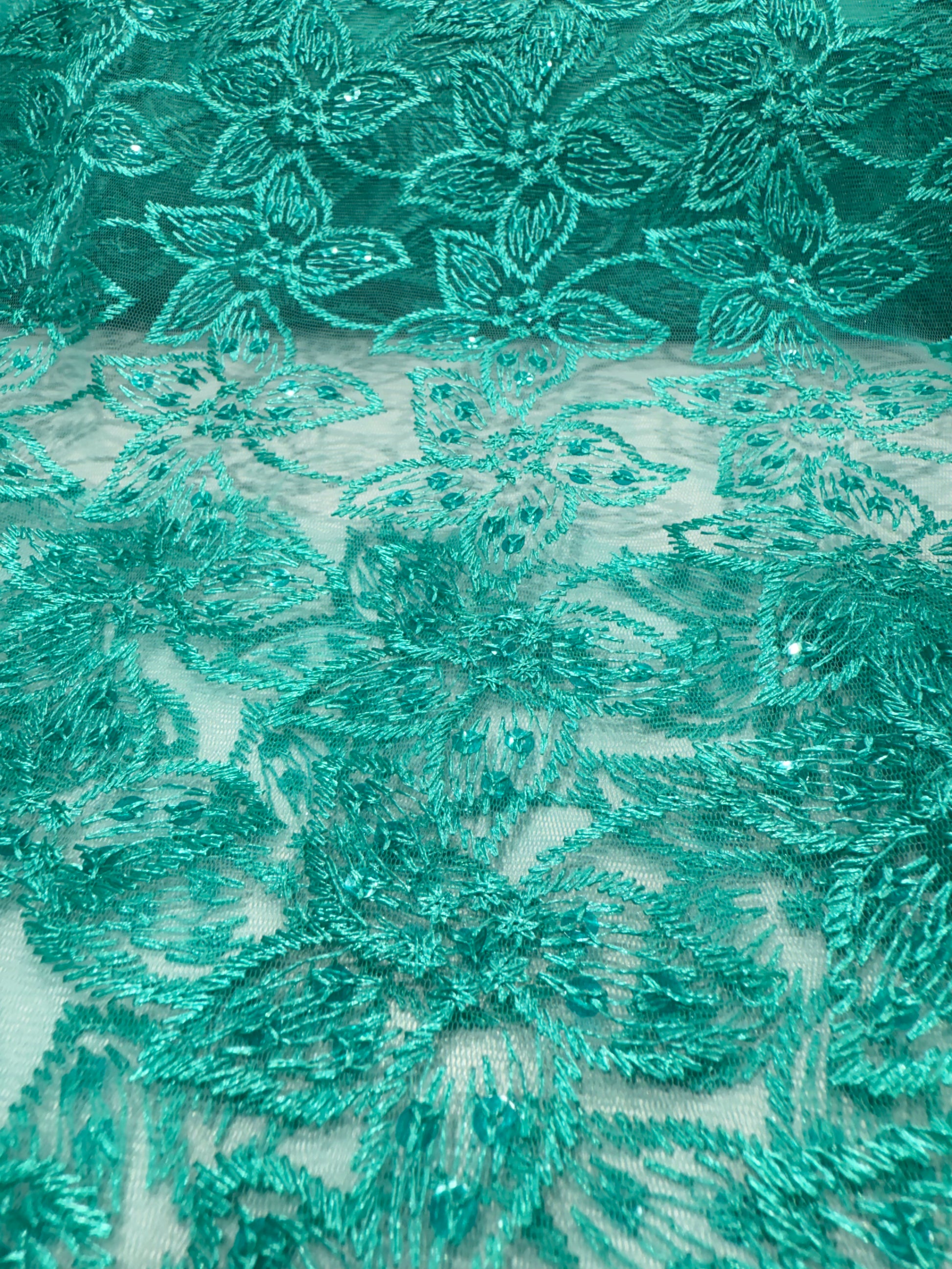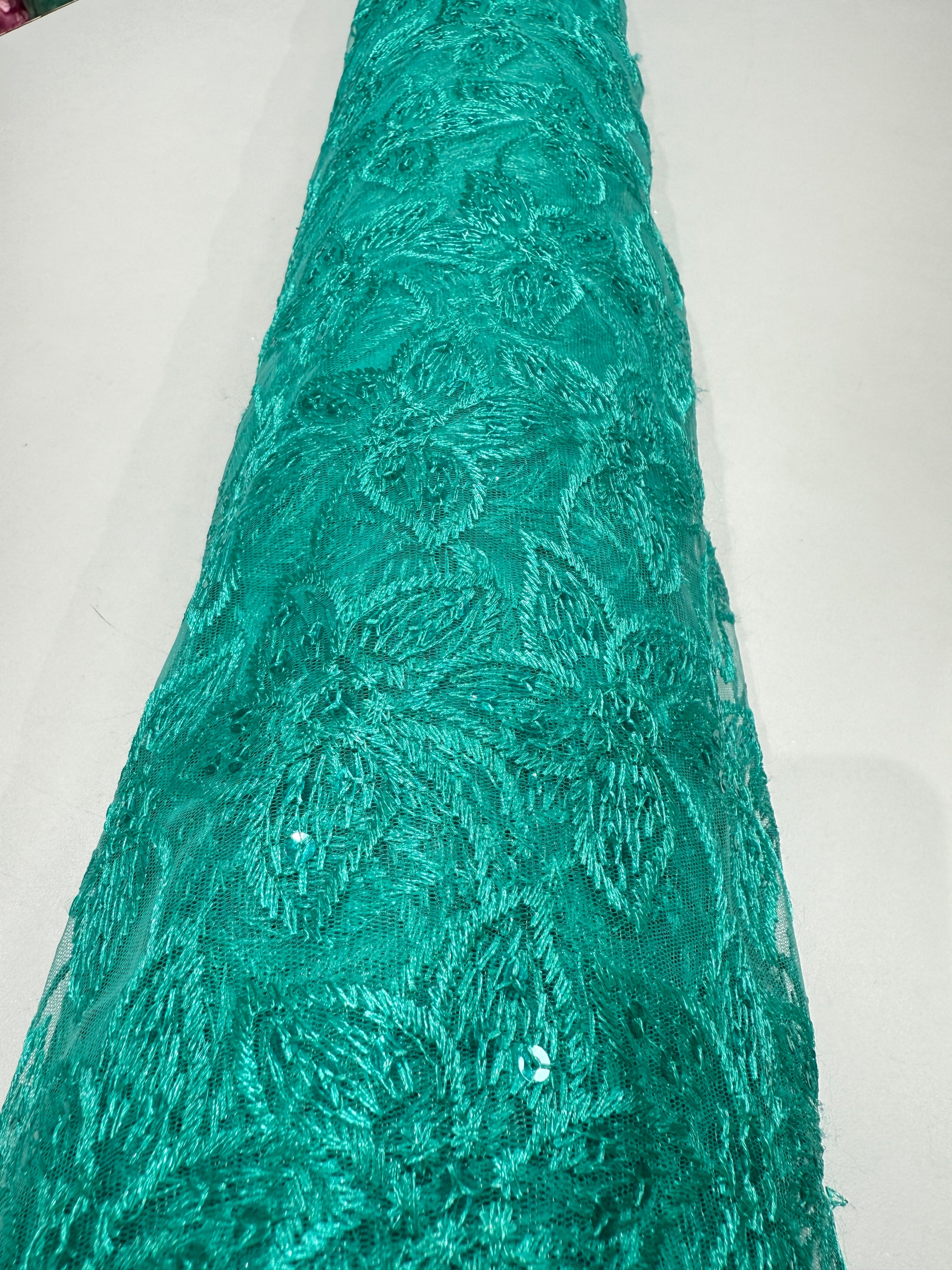 Cyan Green Embroidery Floral Handwork Net 44" Fabric