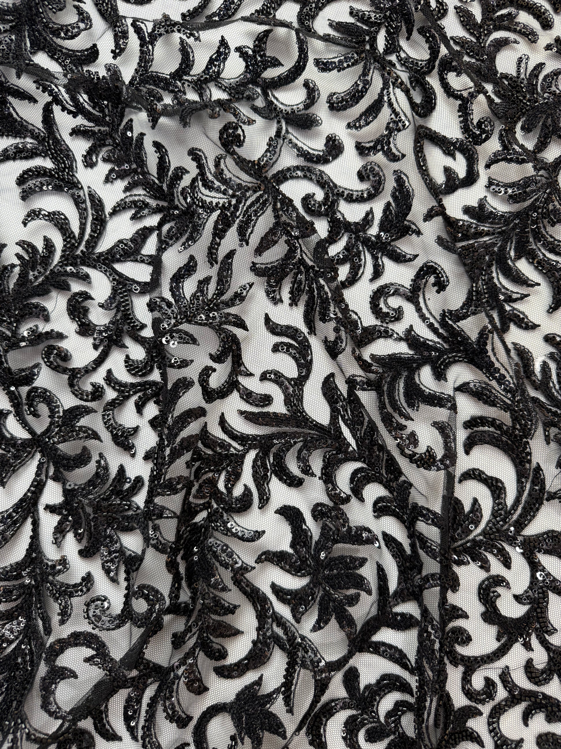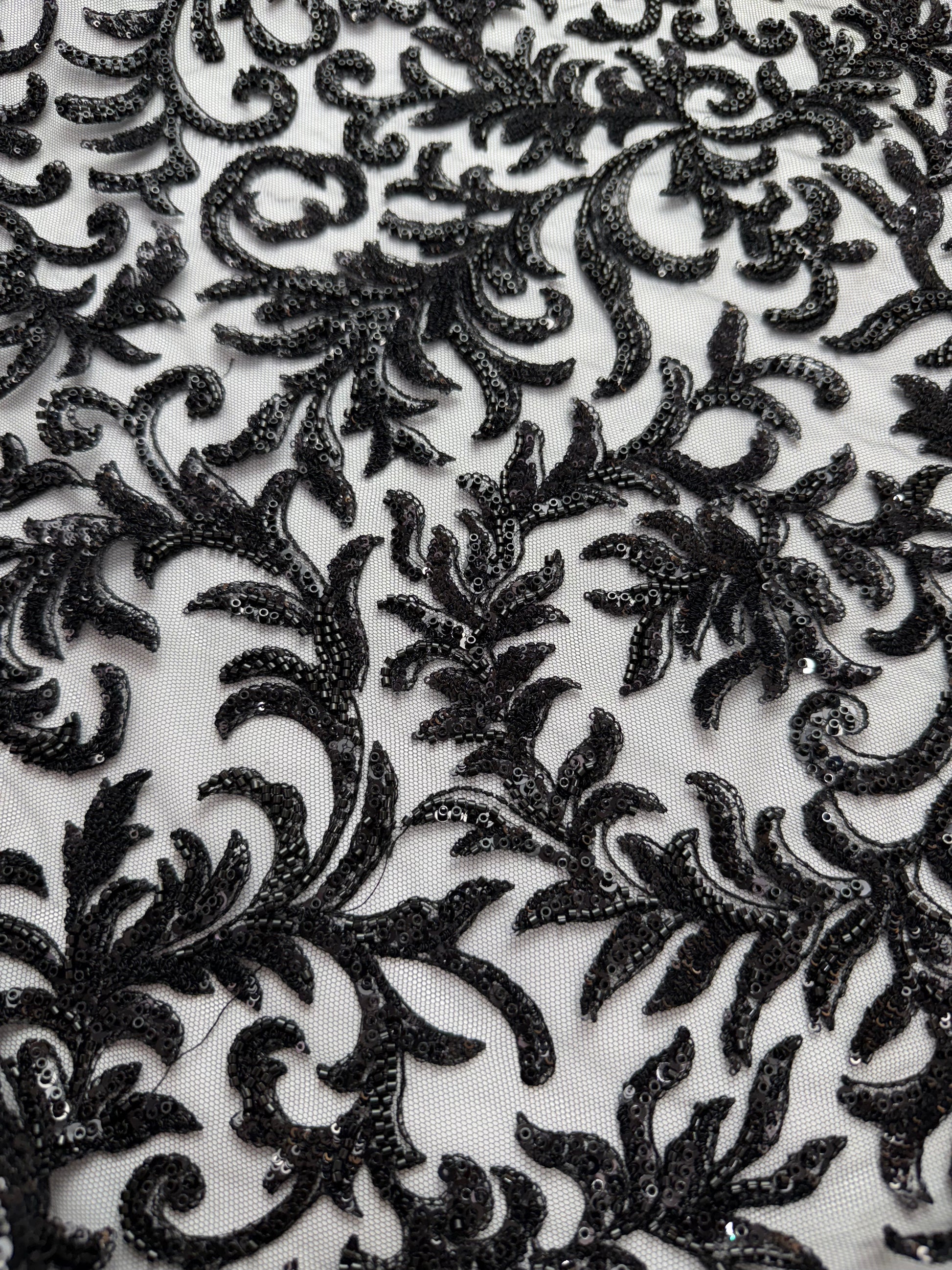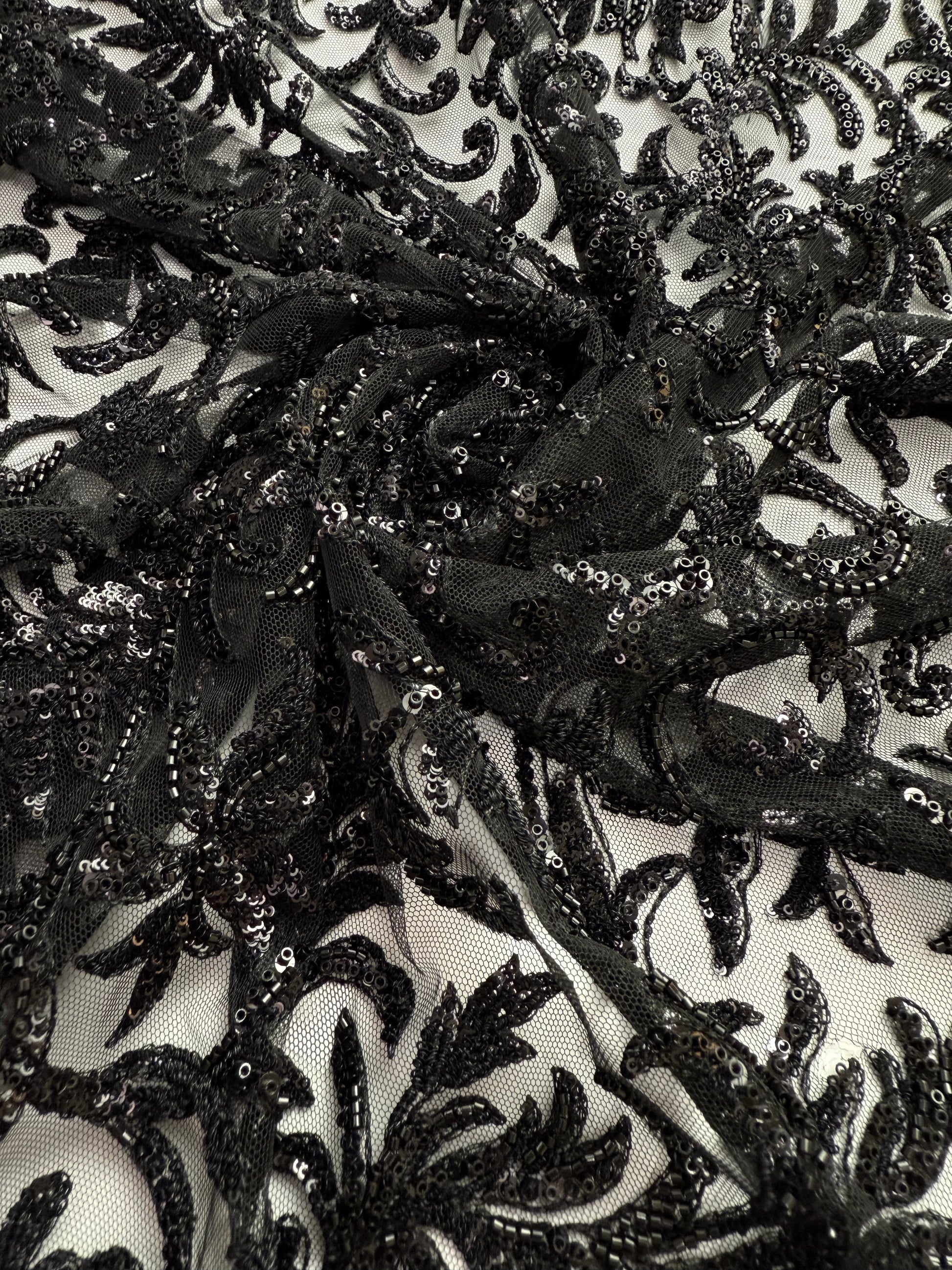 Introducing our Eleganza Black Sequin Lace! With its elegant look and classy texture, this lace adds a touch of sophistication to any wedding dress. It drapes beautifully, providing the perfect fit and making you feel stunning on your special day.