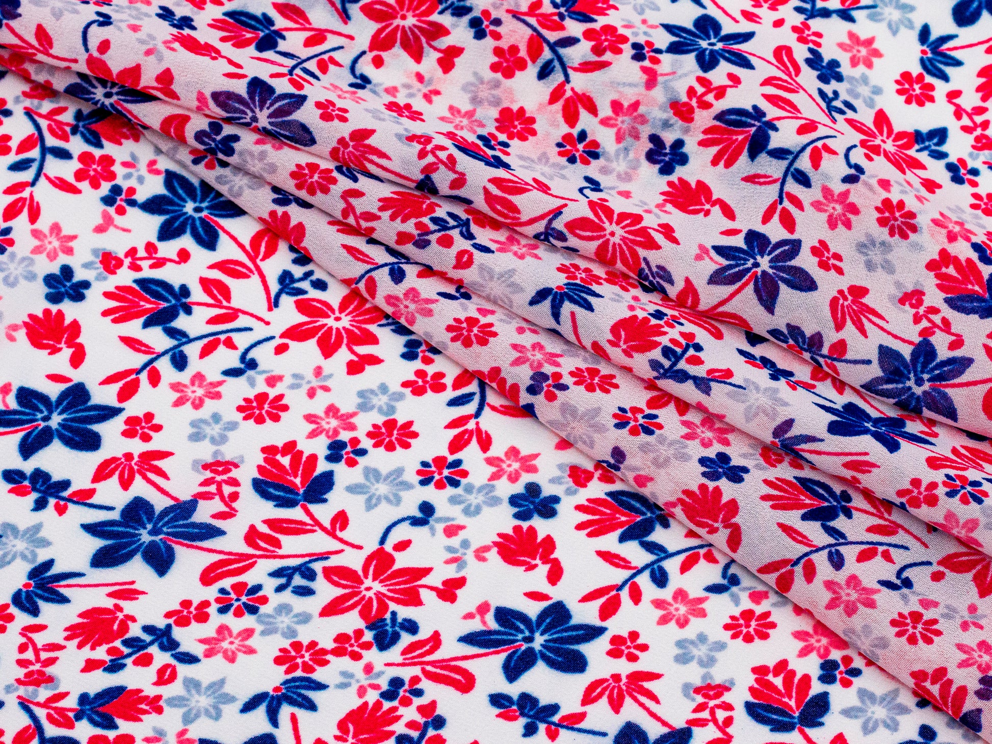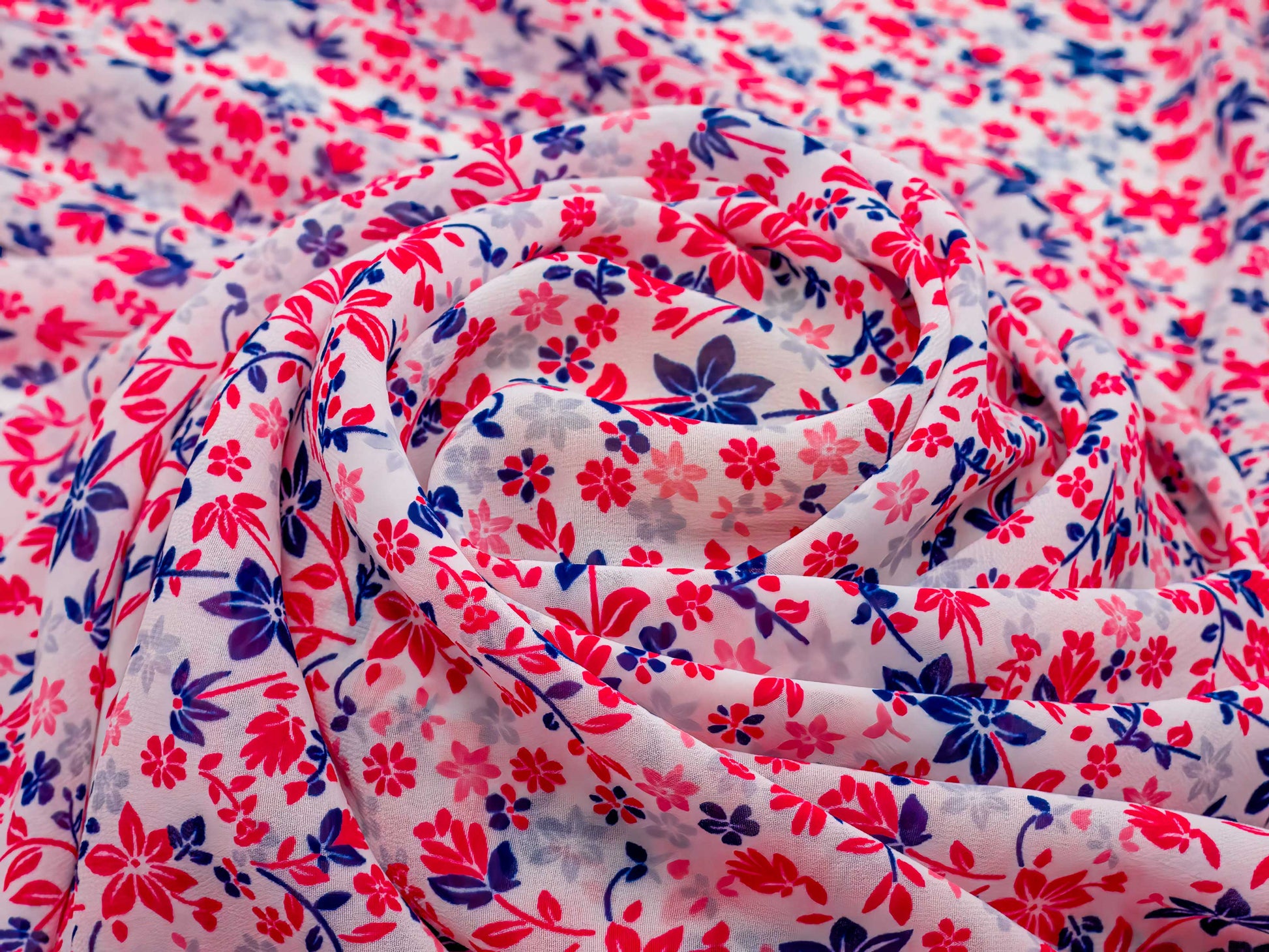 This fabric boasts a base of soft pink, delicately scattered with a vibrant bloom of colorful florals. The georgette weave ensures a beautiful drape, ideal for creating flowy dresses, skirts, or elegant overlays. Its lightweight and breathable nature makes it perfect for warmer climates, keeping you comfortable and stylish all day long.