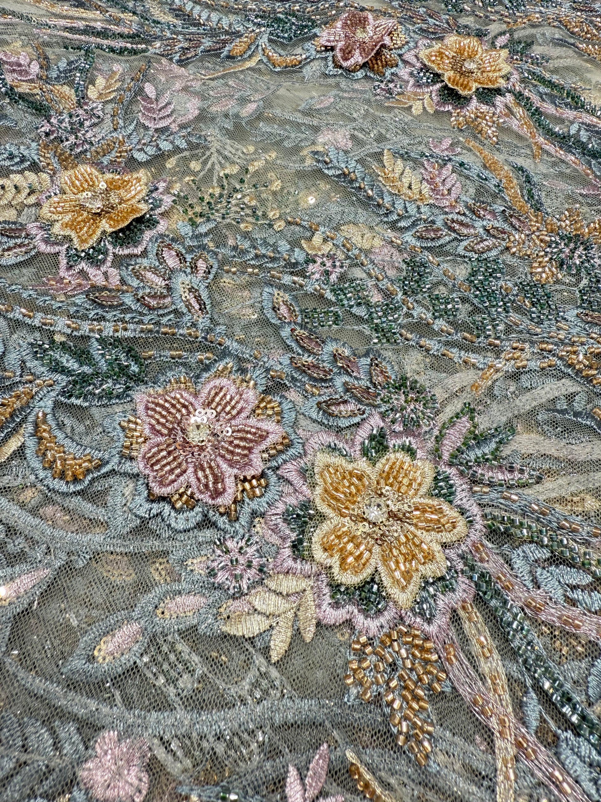 Our green floral applique beaded lace features a stunning floral pattern that adds a touch of elegance to any outfit. The delicate beading work gives it a glamorous shine, making it perfect for gowns and party dresses. Whether you're attending a special event or a lively celebration, this lace will make you feel beautiful and stylish. Elevate your wardrobe with this exquisite fabric!