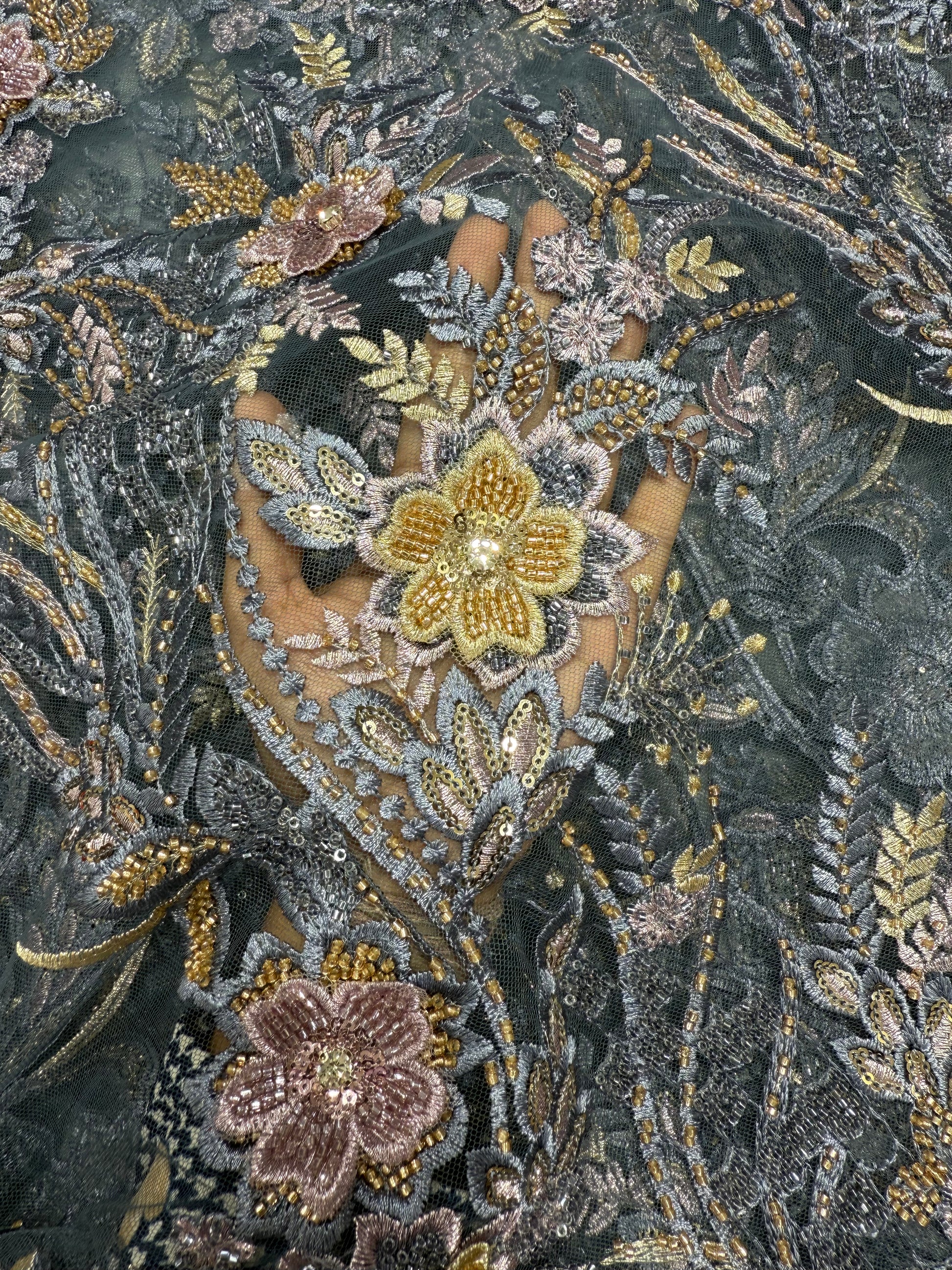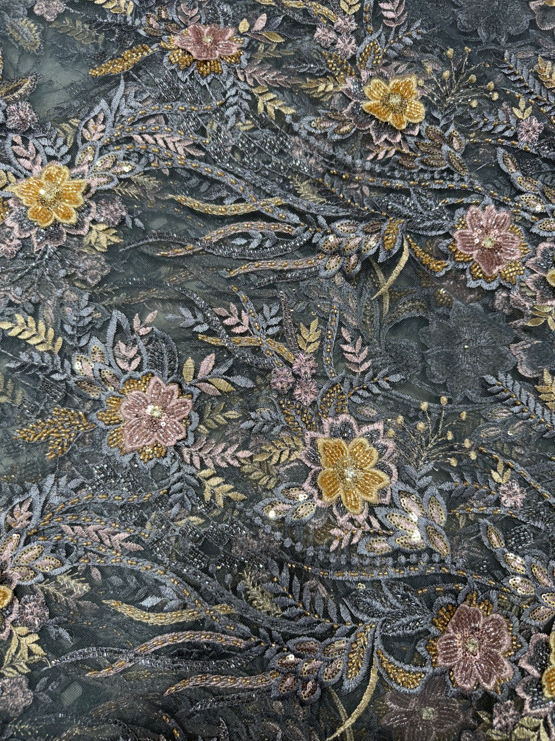 Our grey floral applique beaded lace features a stunning floral pattern that adds a touch of elegance to any outfit. The delicate beading work gives it a glamorous shine, making it perfect for gowns and party dresses. Whether you're attending a special event or a lively celebration, this lace will make you feel beautiful and stylish. Elevate your wardrobe with this exquisite fabric!