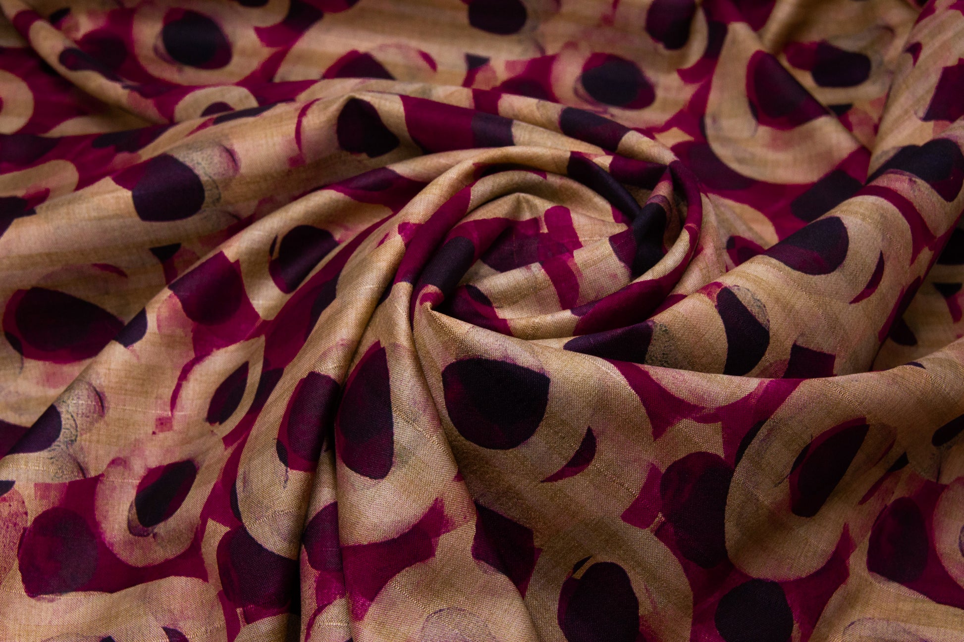 Are you looking for a cloth to sew into a kurta? that this cloth fulfils your needs exactly. This material has a beige background with pink impressions. The material of the cloth is raw silk, which does not allow for sweat absorption.