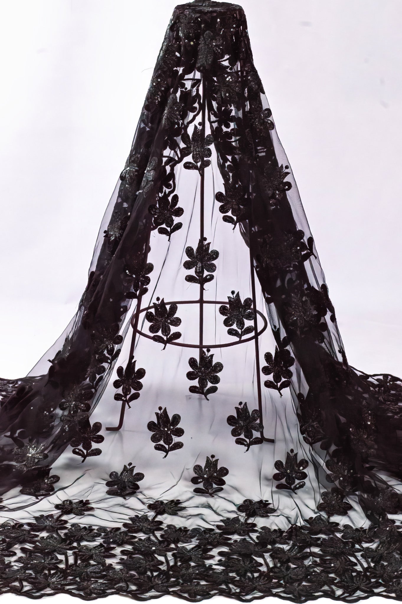This Black beauty Marcus lace is a perfect fit for not tto extravagant yet modest outfits. The delicate flowers embroidered in black are spread freely across the body of the lace. The border comprises of bunches of floral embroideries and a wave shaped embroidered hem. The lace accentuates charm and is ideal for dresses, gowns, lehengas and sarees.