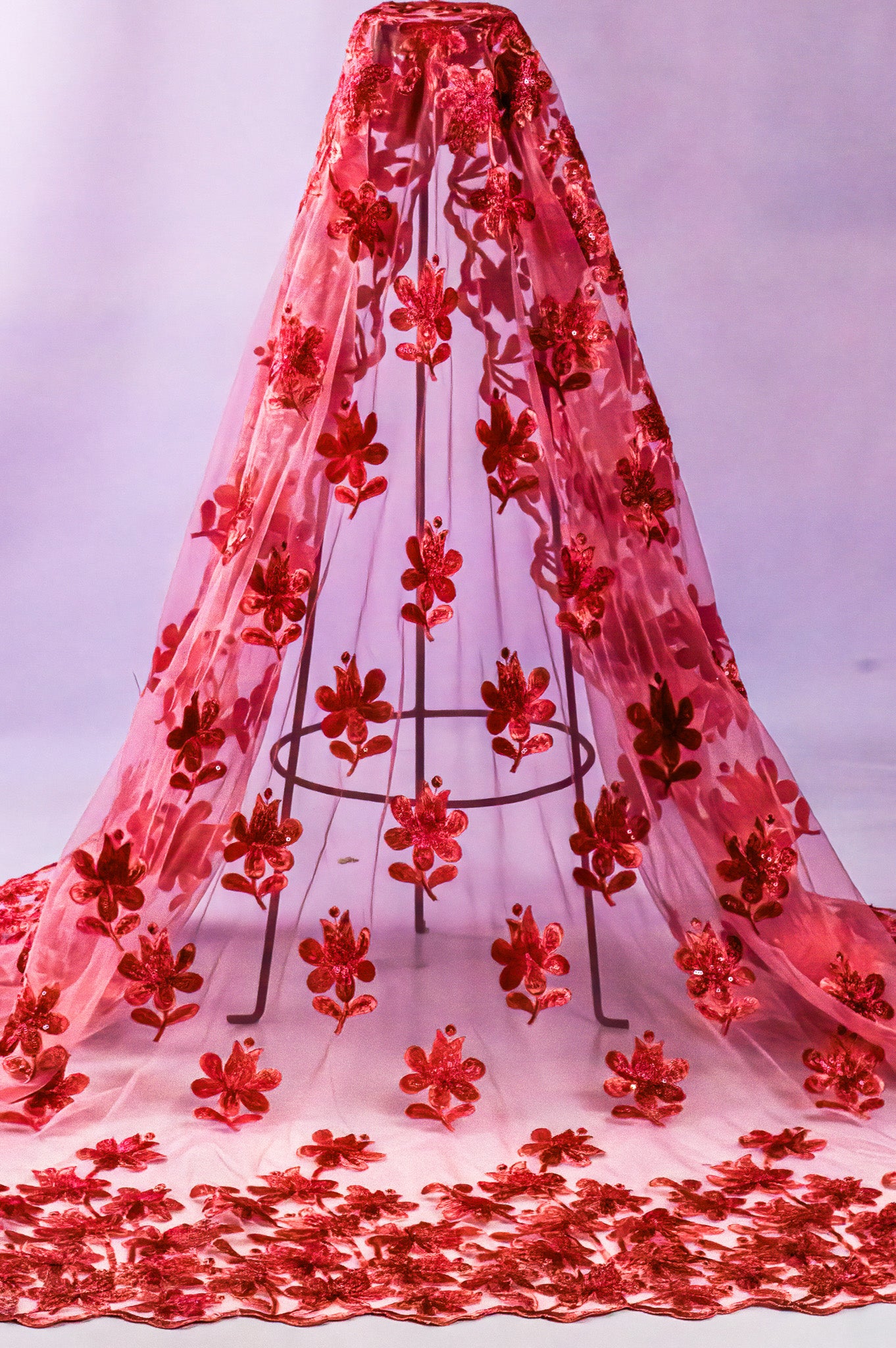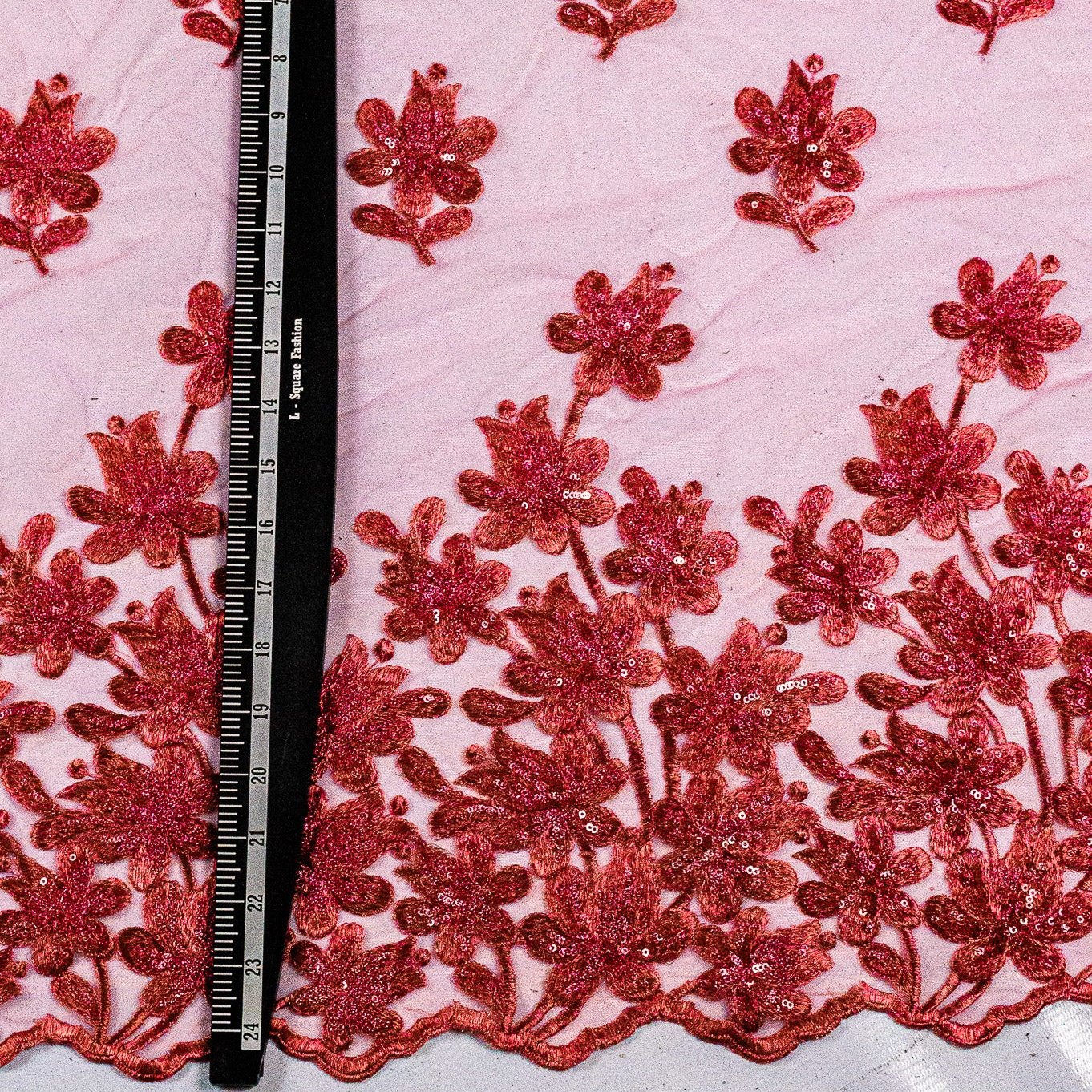 This Rose pink Marcus lace is a perfect fit for not tto extravagant yet modest outfits. The delicate flowers embroidered in Rose pink are spread freely across the body of the lace. The border comprises of bunches of floral embroideries and a wave shaped embroidered hem. The lace accentuates charm and is ideal for dresses, gowns, lehengas and sarees.