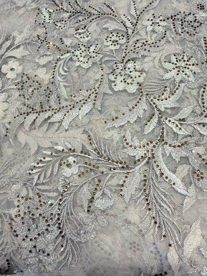 The Nebula Floral Handwork Net is a beautiful fabric featuring lovely flower designs that are carefully stitched with sparkling glitters and beads. This makes the fabric look really special and eye-catching. It's perfect for creating stunning party dresses and elegant gowns, adding a touch of glamour to any outfit.
