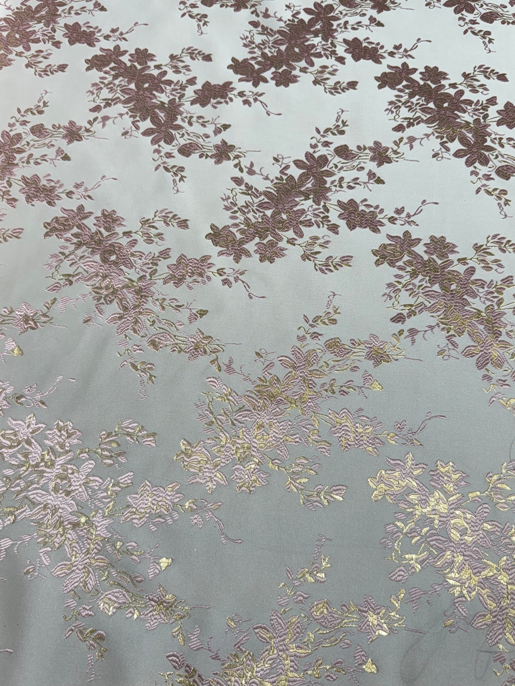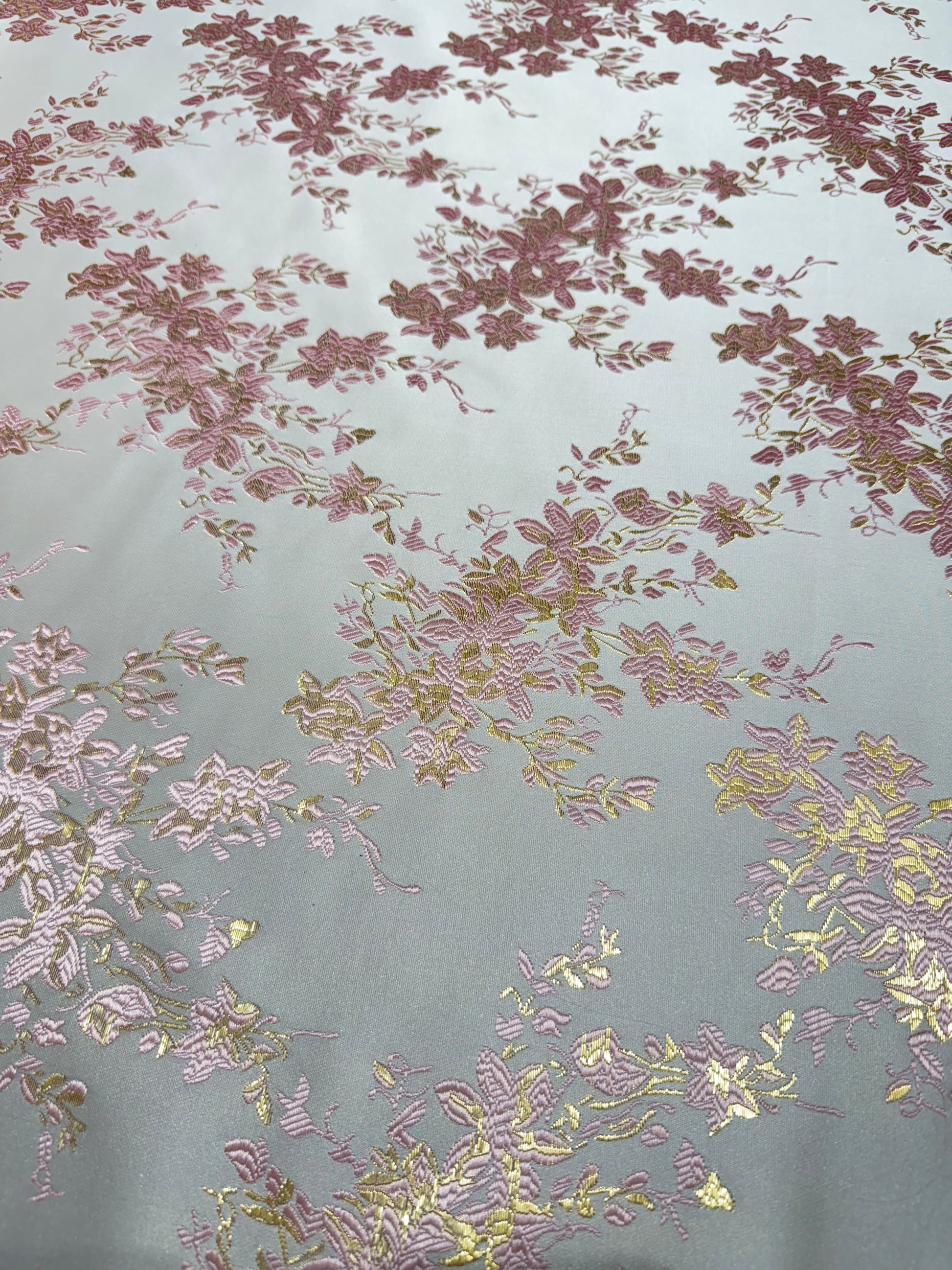 Pink Floral Golden Brocade is a stunning fabric with a shiny golden finish that features beautiful pink floral patterns. Its elegant and fancy look makes it perfect for special occasions like weddings and parties. This premium fabric is ideal for designing dresses, gowns, kurtis, sari blouses, and much more. With its graceful appearance, Floral Golden Brocade adds a touch of luxury to any outfit.