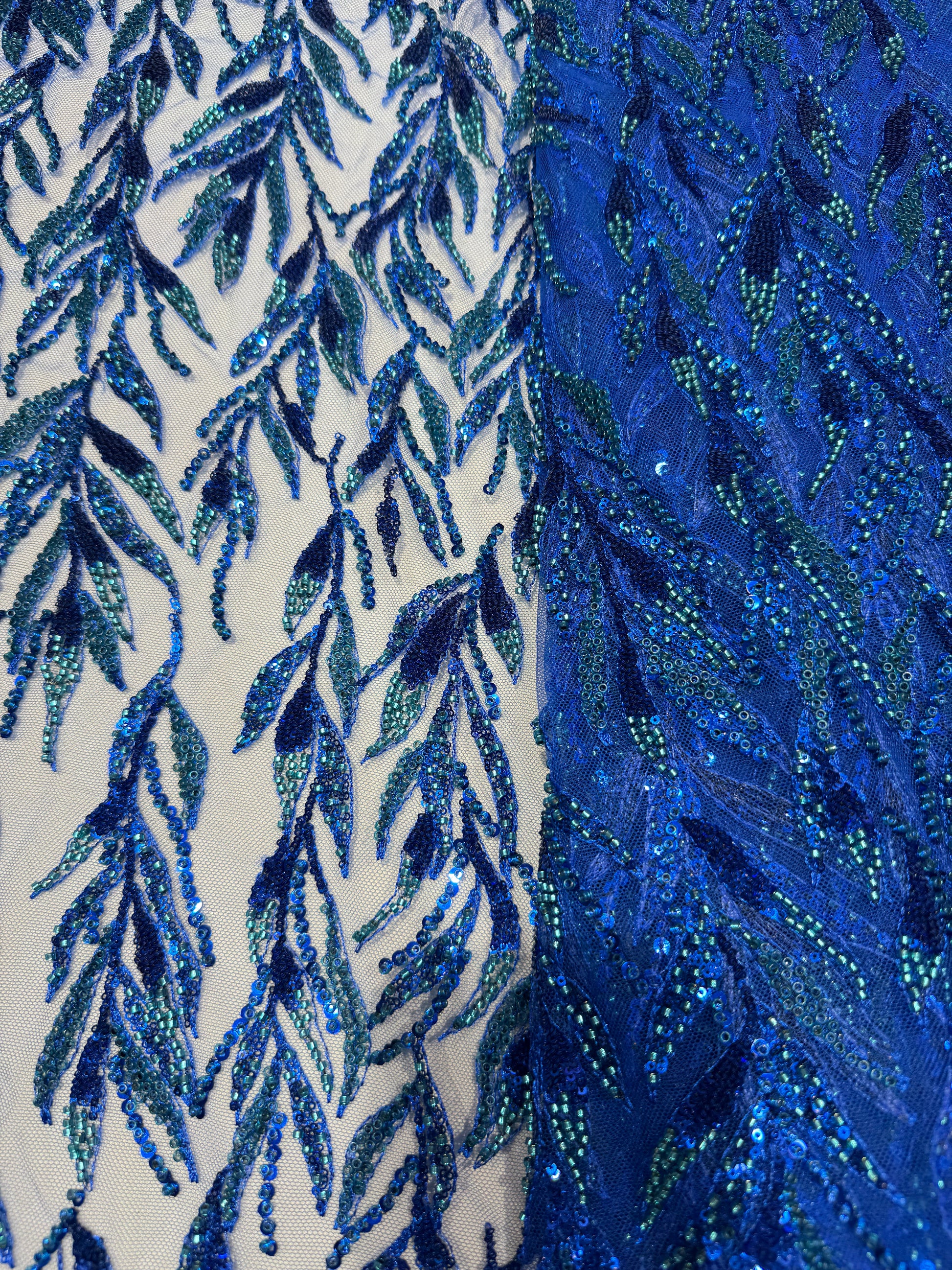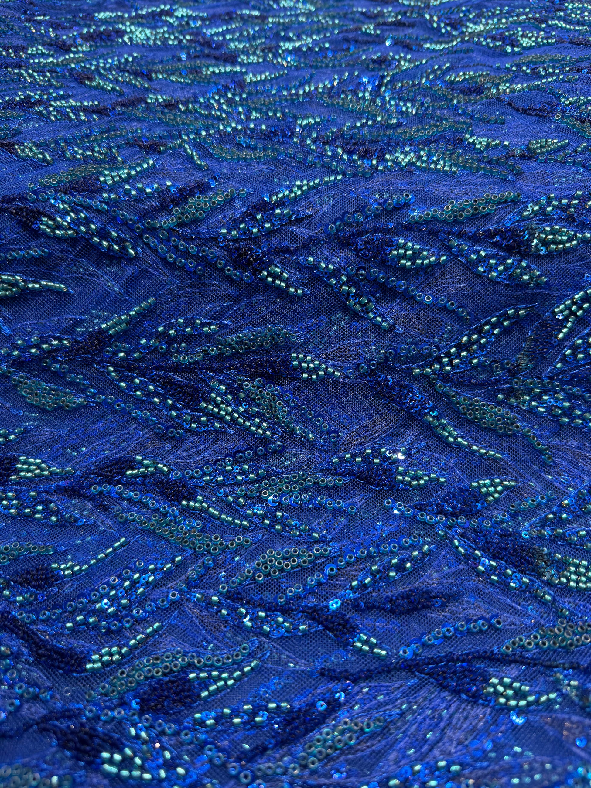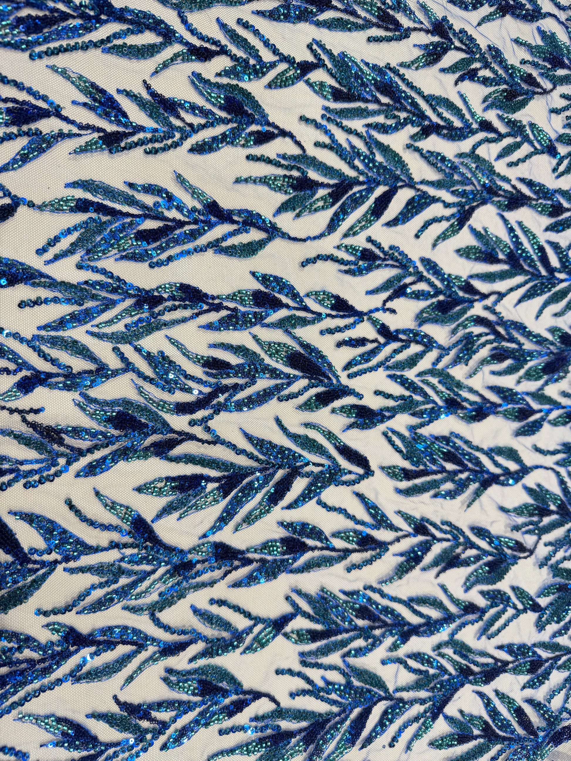Blue Premium Sequin Leaf Handwork Net 56" Fabric