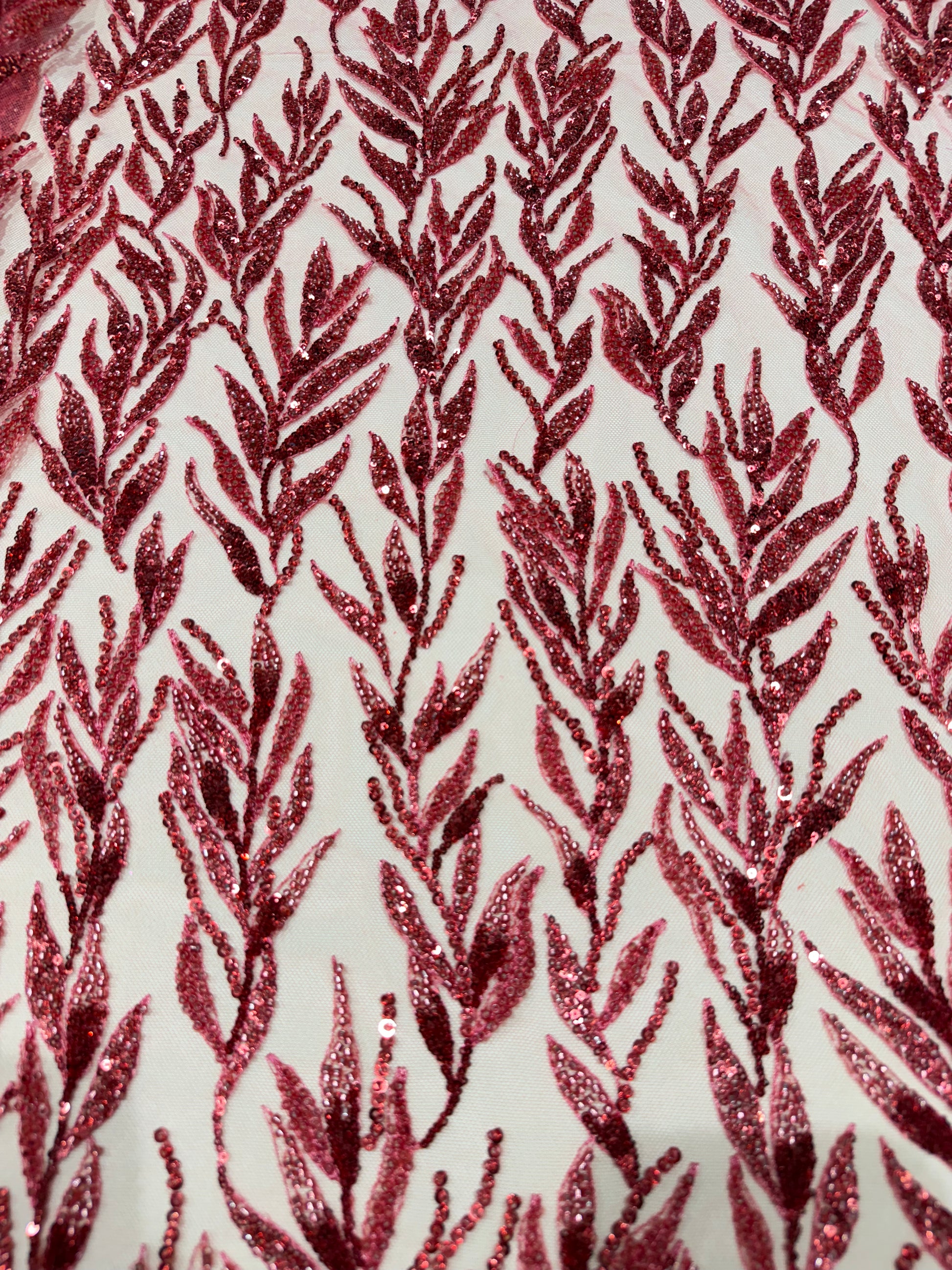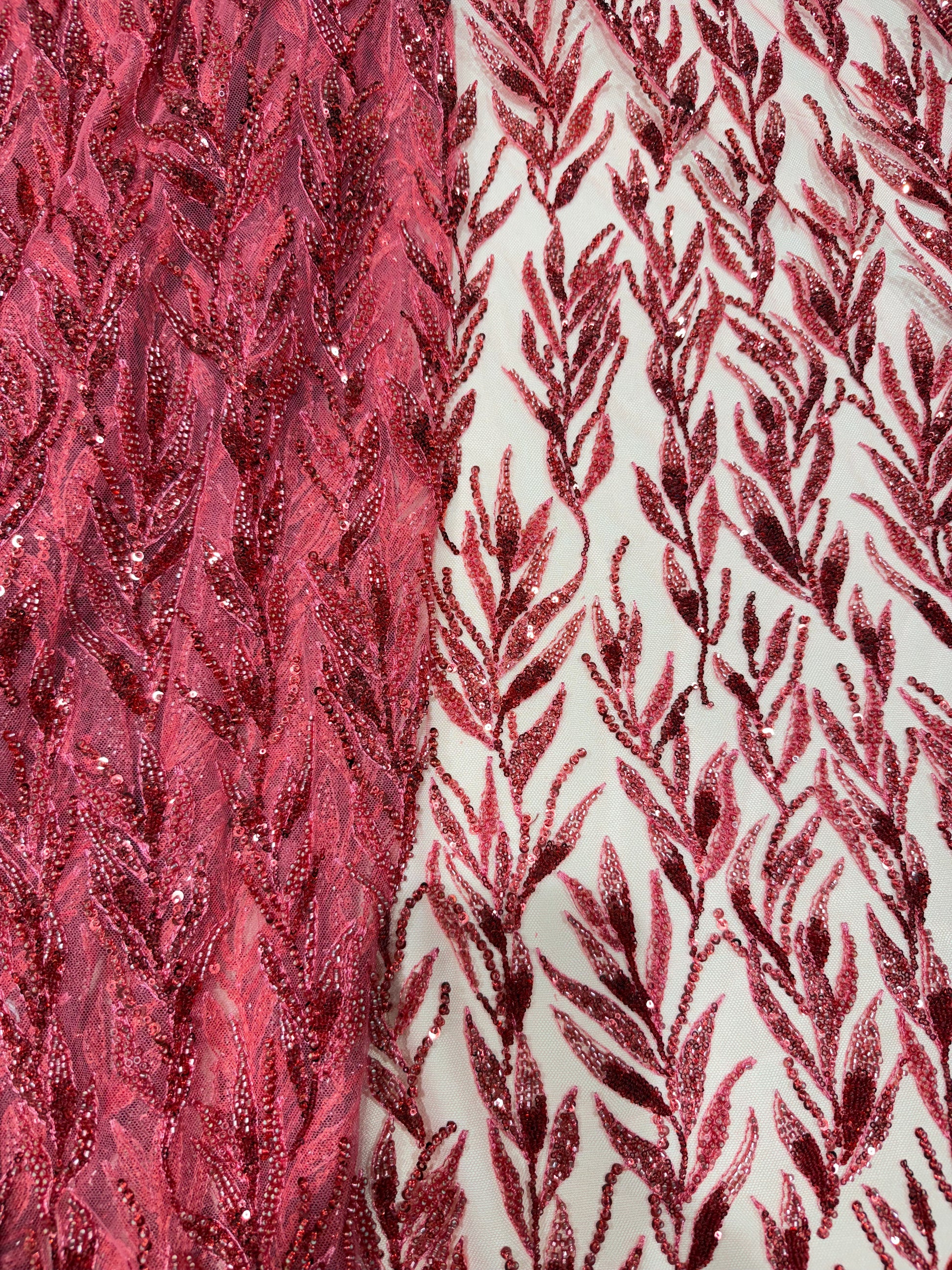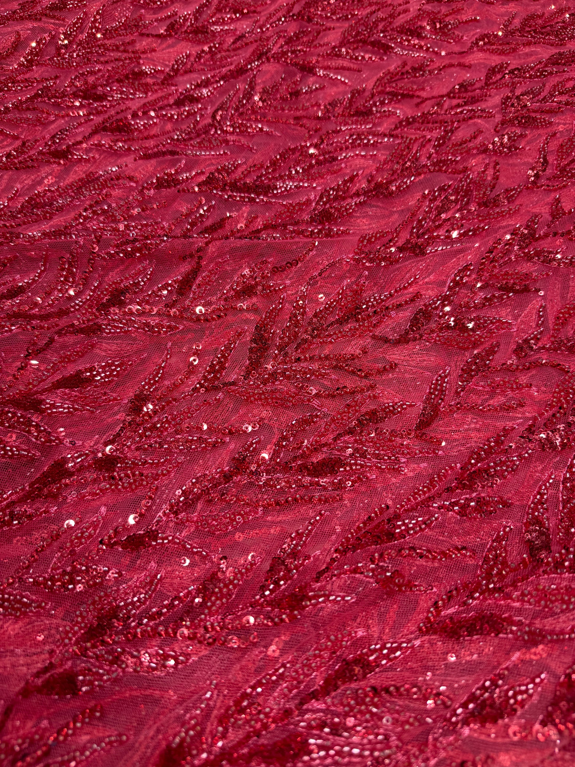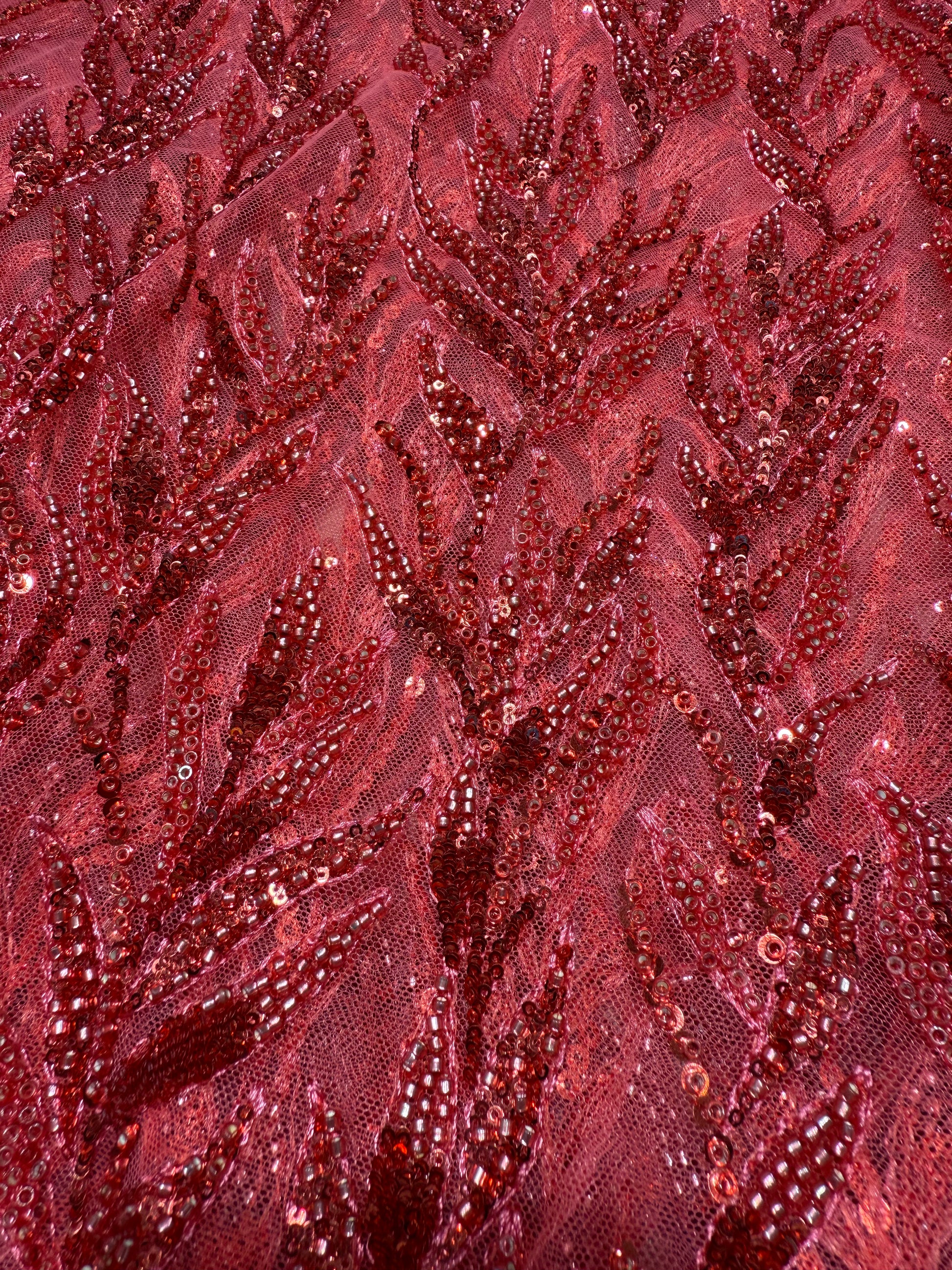 Red Premium Sequin Leaf Handwork Net 56" Fabric
