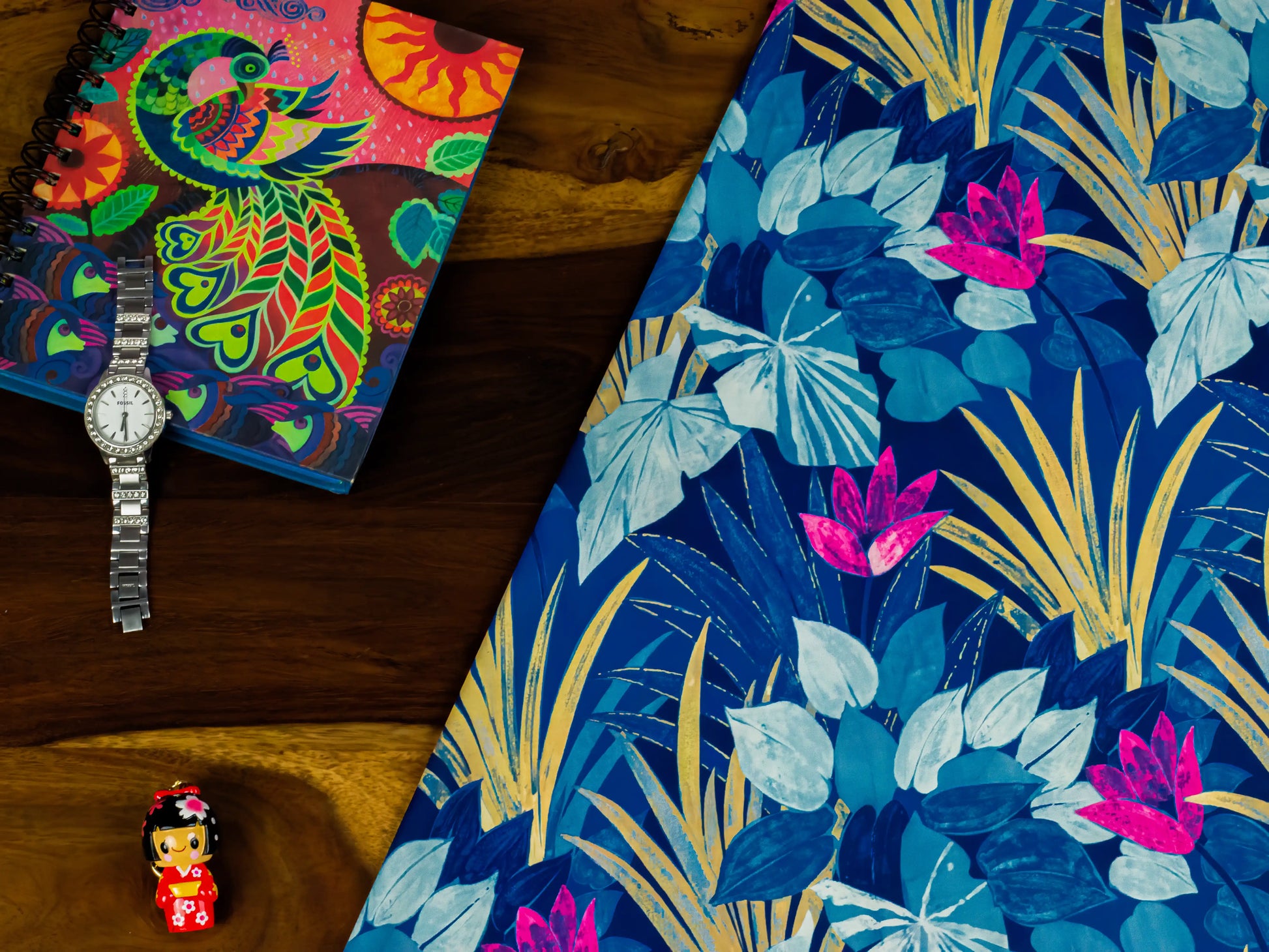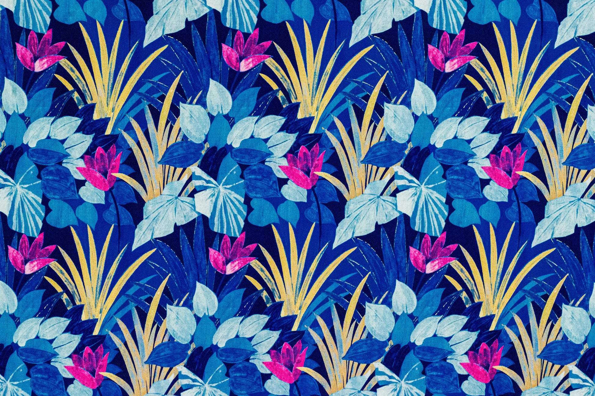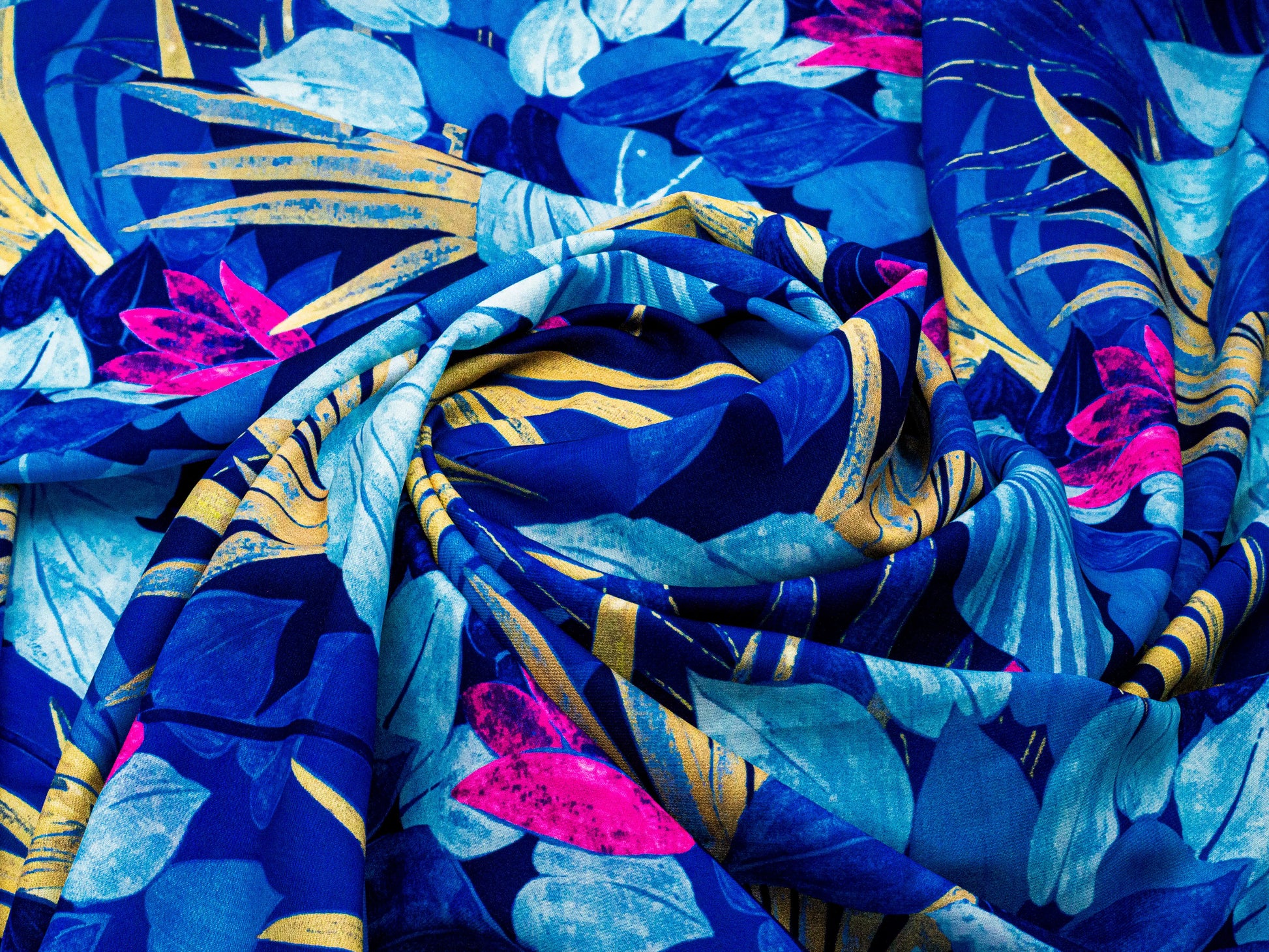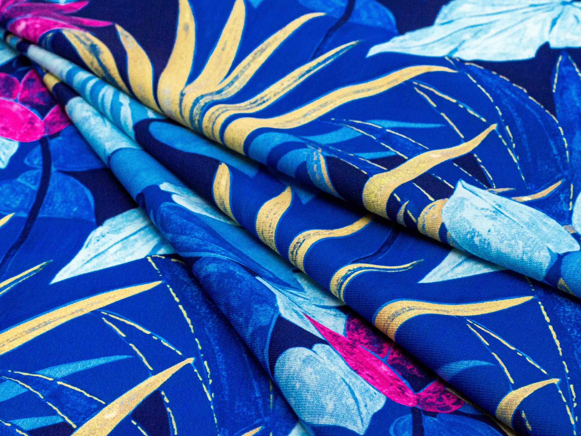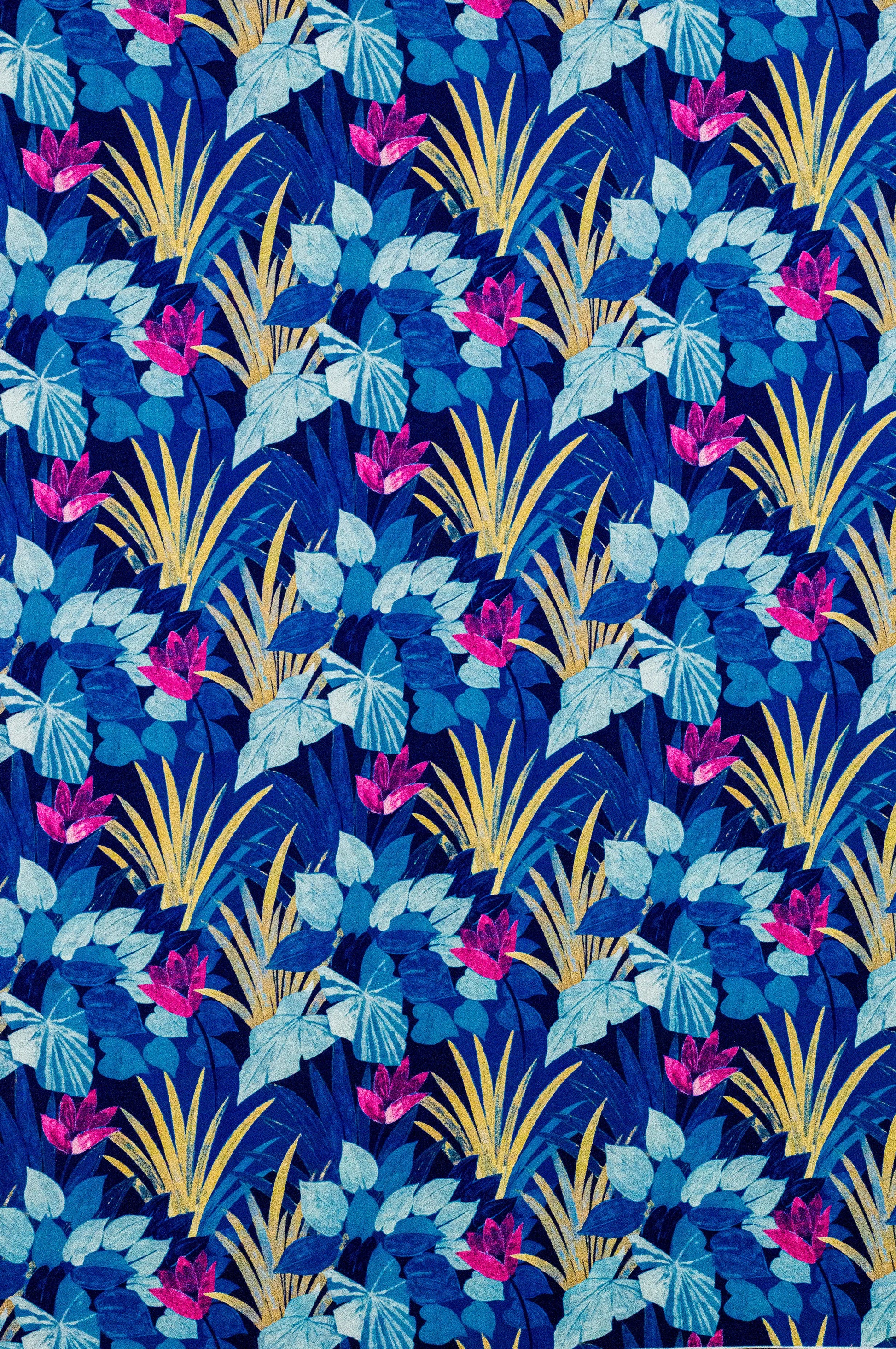 Introducing our exquisite "Tropical Print Jungle Blue" fabric, a captivating tribute to the serenity of lush tropical landscapes. This fabric showcases shades of blue, with hints of purple flowers and delicate yellow grass-like designs, creating a tropical paradise .This fabric can also be used to make elegant resort wear, casual tops, or tropical-themed accessories & outfits.