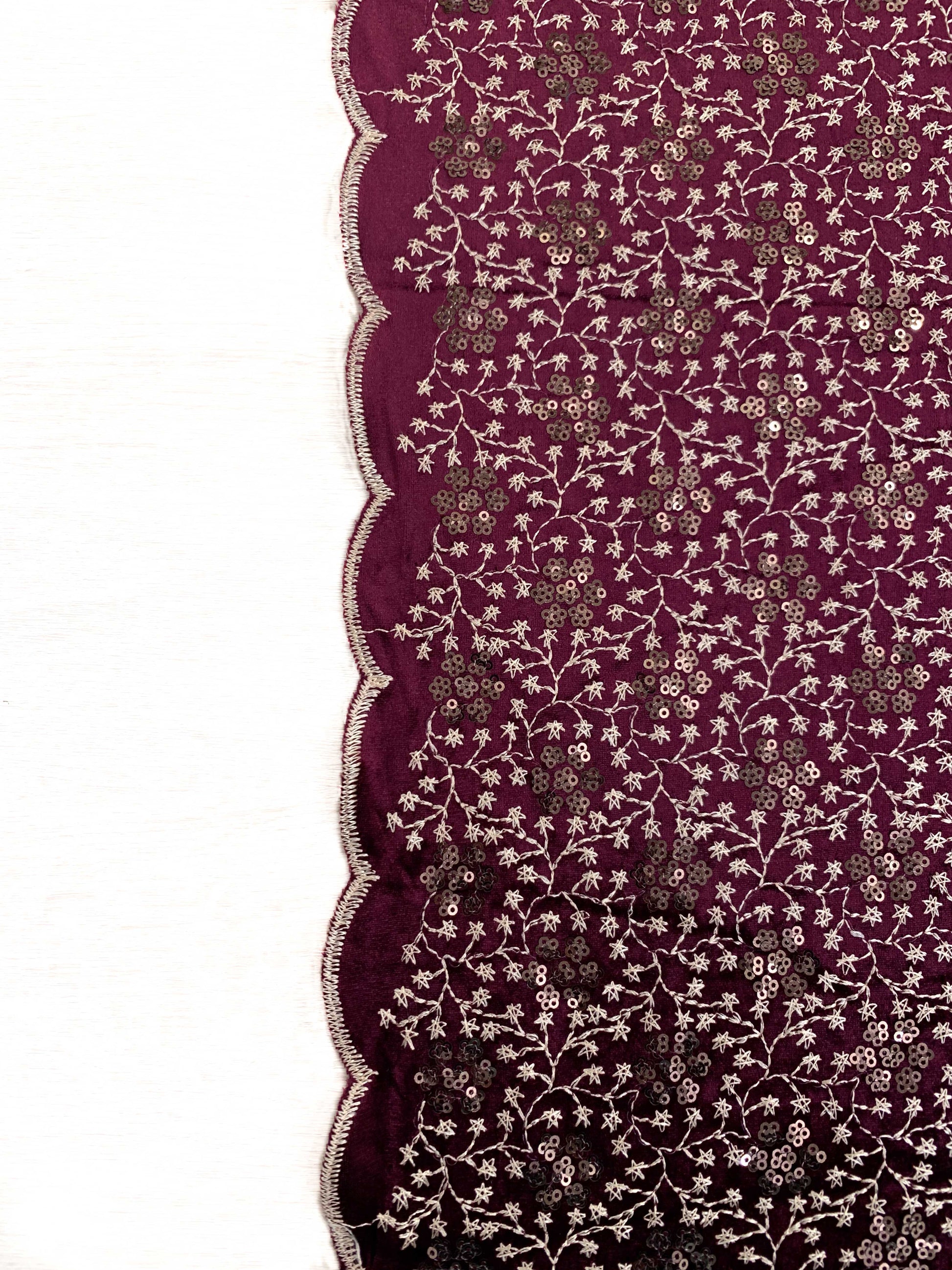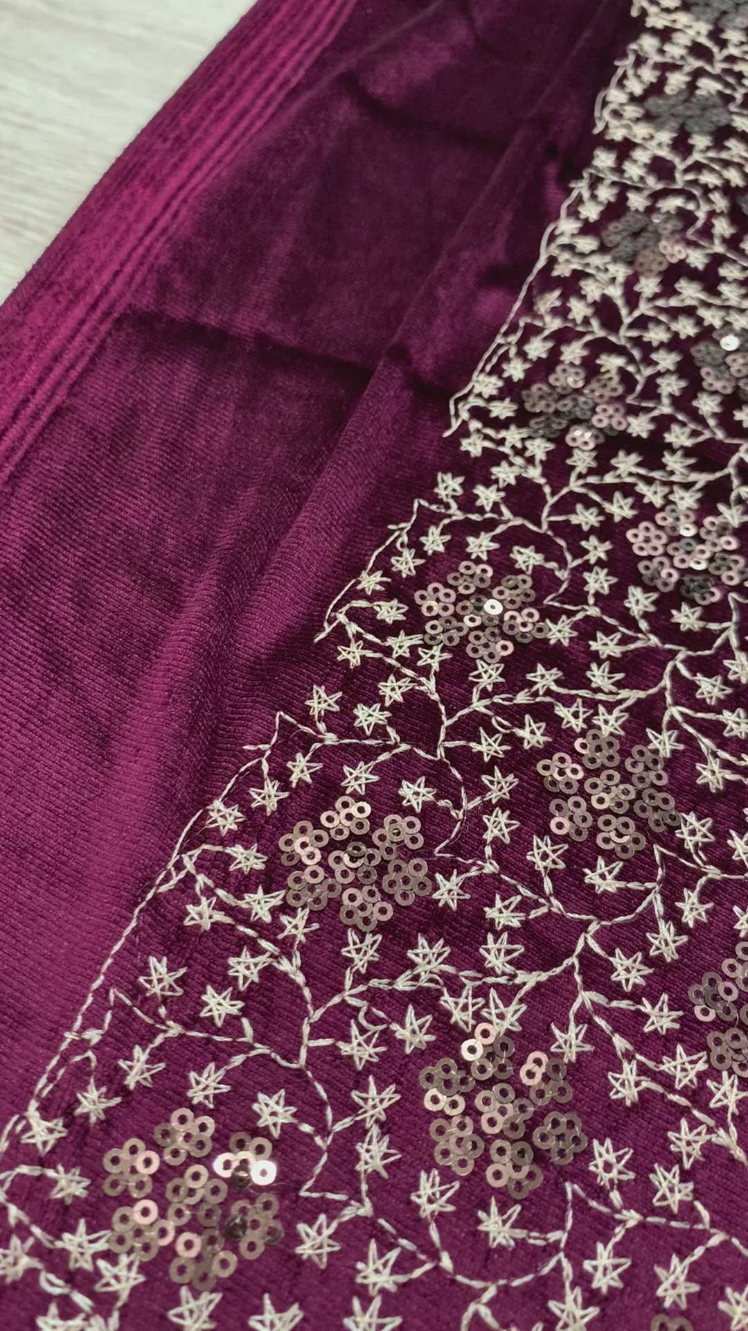 Limited Edition Velvet Maroon Embroidery Lace – designed to elevate your blouses, lehengas, and kurta sets. Crafted from imported maroon velvet material, this lace features a delicate floral sequin design that adds a touch of glamour . it is Soft and comfortable, perfect for extended wear, while the added border enhances its overall elegance. With its exclusive and limited edition status, this lace ensures that your outfit unique..