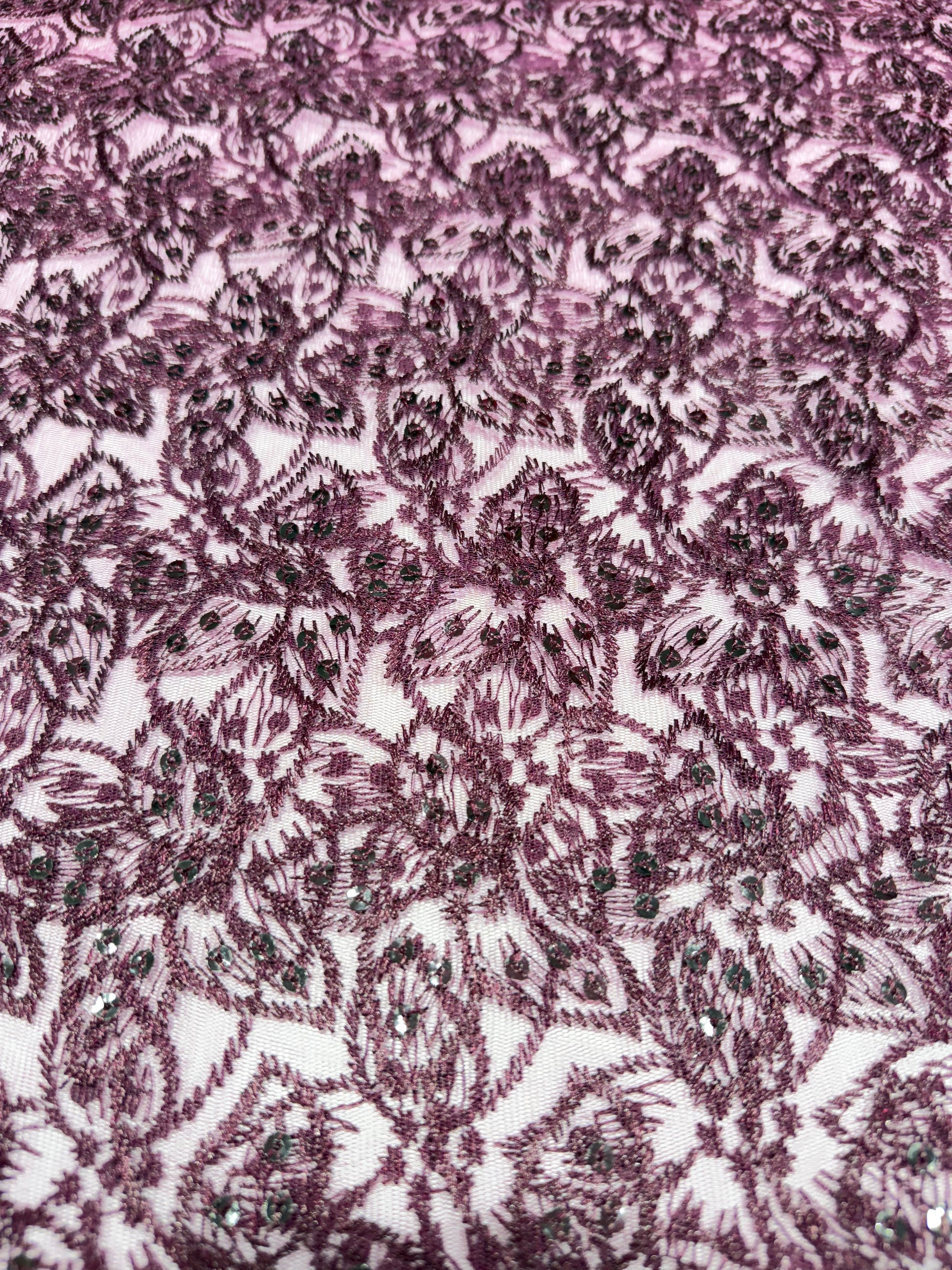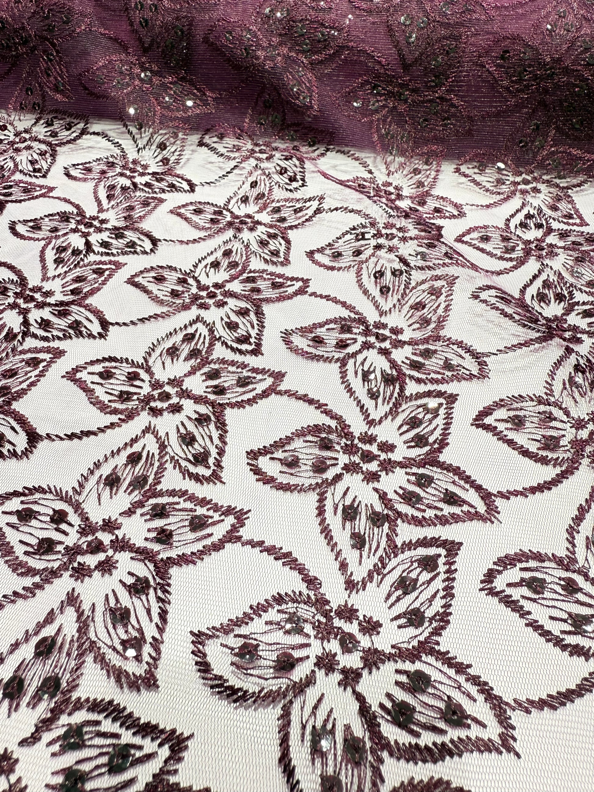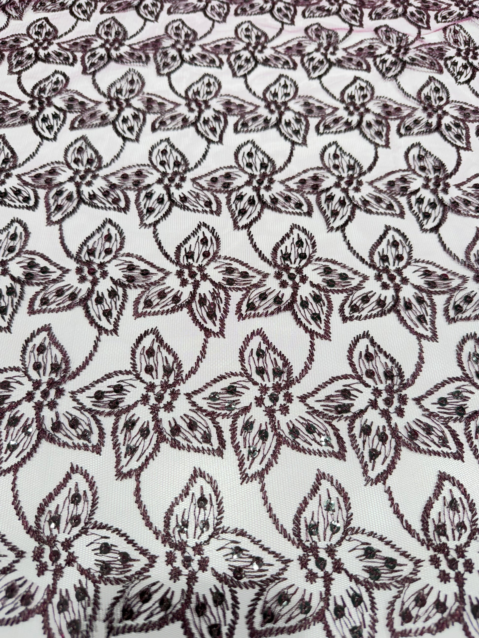 Wine Embroidery Floral Handwork Net 44" Fabric